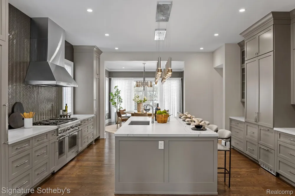 Nestled in Birmingham’s prestigious Quarton Lake Estates, this 4,445 sq. ft. residence was completed in 2023 by esteemed luxury builder Brandywine Construction. Featuring 5 bedrooms, 5.1 baths, and the convenience of a private in-home elevator, it seamlessly combines timeless architectural design with modern functionality. The exterior is defined by natural stone and clean lines, enhanced by professional landscaping that creates a striking first impression. Inside, sunlight pours through Marvin windows, framing every room with natural light. The living area is anchored by a striking fireplace wall and opens seamlessly to the outdoor terrace—perfect for effortless entertaining. At the center of the home, a gourmet chef’s kitchen features custom cabinetry, an oversized island, and a premium Thermador appliance package. A richly detailed study with a stately fireplace blends elegance with practicality, while Control 4 Home Automation allows you to manage lighting, audio, security, and climate with ease. The primary suite showcases vaulted ceilings, dual closets, and a spa bath with heated floors, twin vanities and a freestanding tub, creating a true sanctuary. Additional en suite bedrooms provide comfort and privacy for family and guests, while a convenient large second-floor laundry adds daily ease. The finished lower level elevates the lifestyle experience with a Dolby surround-sound theater, temperature-controlled wine room, stylish wet bar with a waterfall stone counter, and a guest suite that doubles as a fitness room. High-end audio and video equipment throughout the home ensures a refined living and entertainment experience at every turn. Outdoors, a covered front porch offers unobstructed views of the river, extending the living space with both beauty and tranquility. The home is further enhanced with high-end luxury finishes throughout, a full-house generator for peace of mind, and an attached two-car garage.
